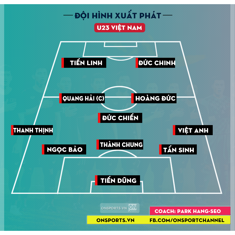 Đội hình ra sân của U23 Việt Nam: Thủ môn Bùi Tiến Dũng bắt chính!Ở hàng công, HLV Park Hang Seo đã sử dụng cả 2 mũi trung phong là Đức Chinh và Tiến Linh. Hỗ trợ cho bộ đôi này là Quang Hải. Hai cầu thủ được sử dụng ở vị trí tiền vệ trung tâm là Đức Chiến và Hoàng Đức.