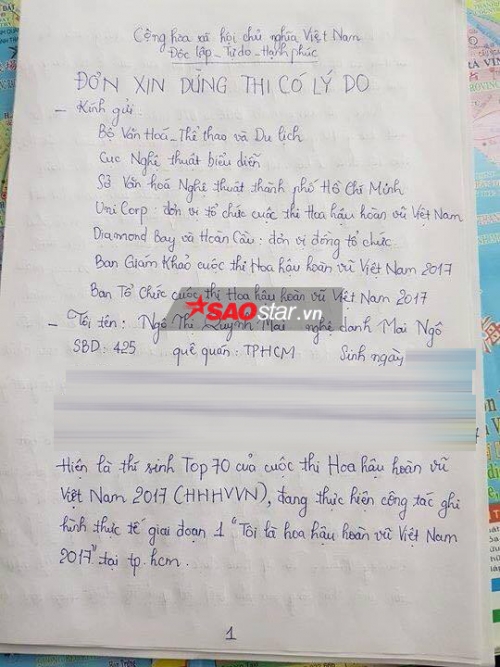 Cuối tuần qua, làng giải trí đã xôn xao với lá thư viết bằng tay gửi Bộ VH-TT&DL của Mai Ngô, kèm theo lý do bỏ thi Hoa hậu Hoàn vũ Việt Nam 2017.