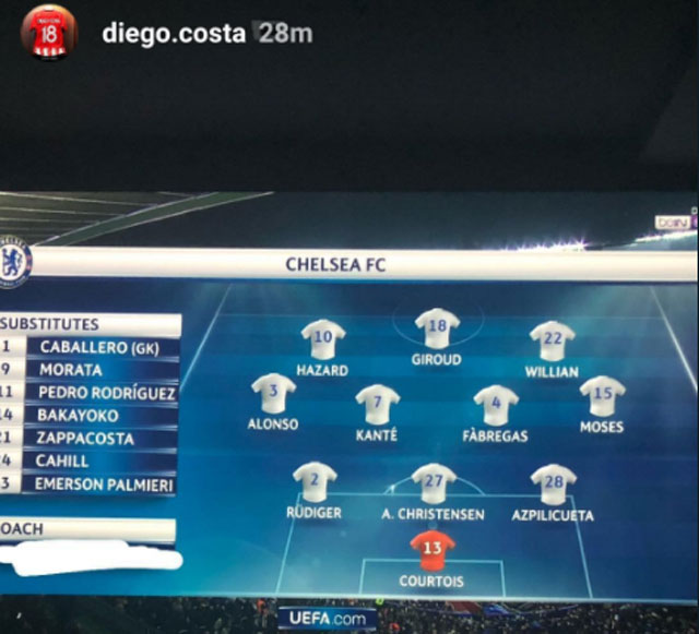 Trong trận đấu vừa qua, Costa không dự khán tại sân Nou Camp nhưng anh vẫn theo dõi trận đấu qua tivi. Khi đội hình xuất phát của đôi bên được công bố, tiền đạo người Tây Ban Nha đã chụp màn hình và chia sẻ bức ảnh lên mạng xã hội Instagram.