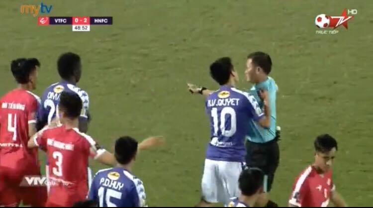 Nhưng tình huống quay chậm rõ ràng cho thấy tay Văn Quyết đã vung trúng mặt cầu thủ Viettel. Tình huống này xứng đáng nhận thẻ vàng. Văn Quyết cũng phải bị đuổi khỏi sân. Vì đội trưởng CLB Hà Nội đã nhận 1 thẻ vàng ở hiệp 1. Sự khác biệt là Văn Quyết không đáng phải nhận thẻ đỏ trực tiếp, còn chuyện bị đuổi khỏi sân là chính xác.