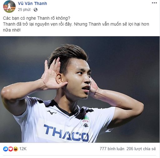 Ngay sau khi ghi bàn, Văn Thanh háo hức khoe chiến tích với người hâm mộ khi đăng tải hình ảnh ăn mừng bàn thắng cùng dòng caption đầy cá tính: “Các bạn có nghe rõ Thanh không? Thanh đã trở lại nguyên vẹn rồi đấy. Nhưng Thanh vẫn muốn sẽ lợi hại hơn nữa”.