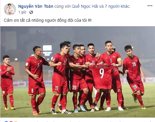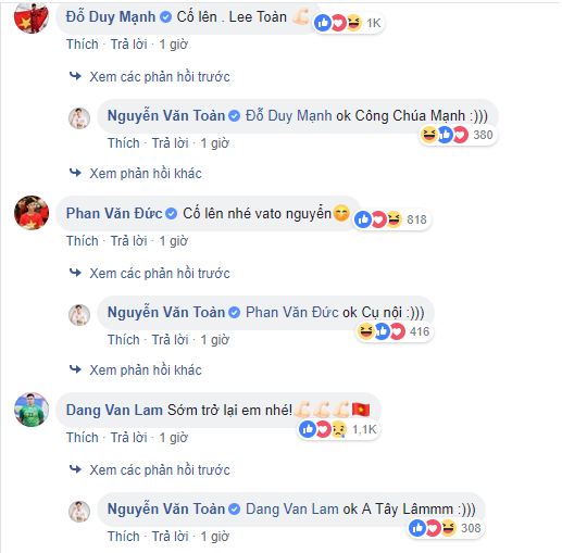 Dòng trạng thái của Văn Toàn nhận được rất nhiều sự quan tâm của các đồng đội trong ĐTVN.