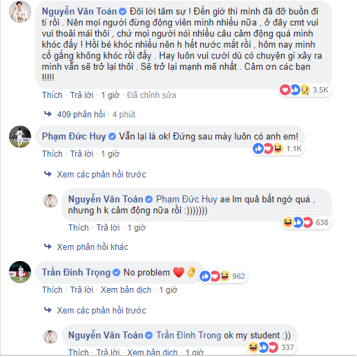Văn Toàn nén nước mắt chia sẽ tiếp: “Đôi lời tâm sự ! Đến giờ thì mình đã đỡ buồn đi tí rồi . Nên mọi người đừng động viên mình nhiều nữa , ở đây comment vui vui thoải mái thôi , chứ mọi người nói nhiều câu cảm động quá mình khóc đấy ! Hồi bé khóc nhiều nên giờ hết nước mắt rồi , hôm nay mình cố gắng không khóc rồi đấy . Hay luôn vui cười dù có chuyện gì xảy ra mình vẫn sẽ trở lại thôi . Sẽ trở lại mạnh mẽ nhất . Cảm ơn các bạn !!!!!”