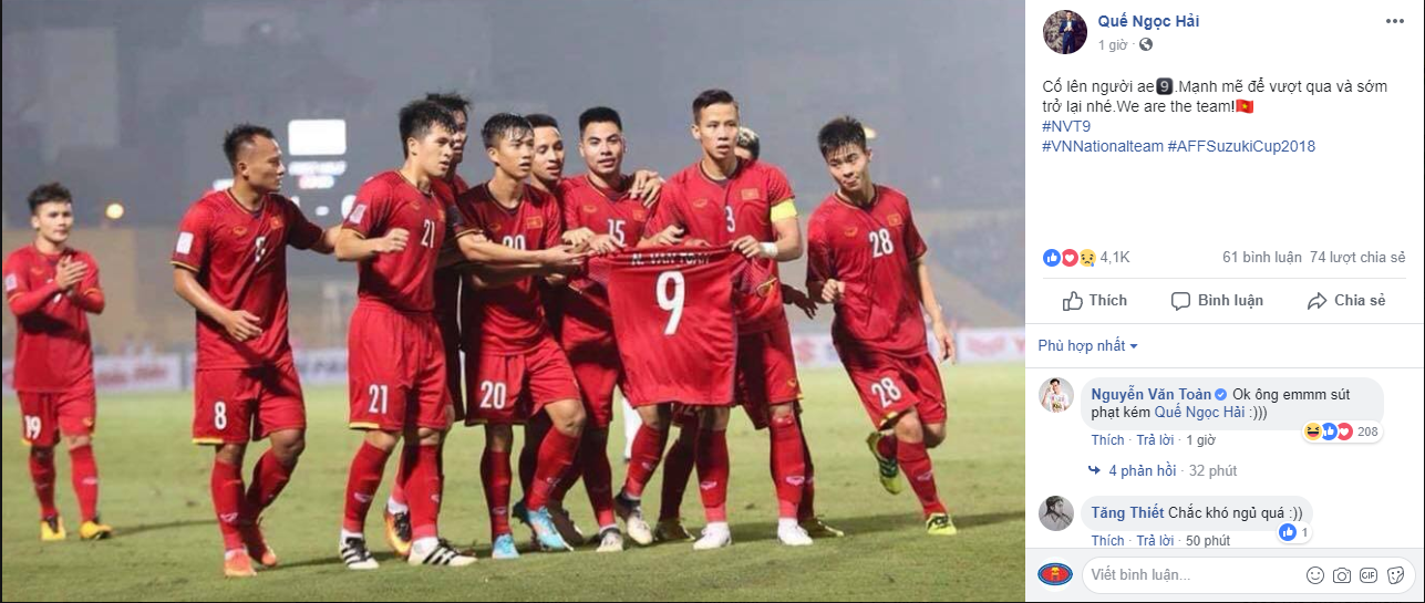 Trong khi đó, trung vệ đội phó Quế Ngọc Hải đăng hẳn 1 dòng trạng thái dành riêng cho người đồng đội kém may mắn: “Cố lên người anh em. Manh mẽ để vượt qua và sớm trở lại nhé. We are the team(chúng ta là một đội)”.