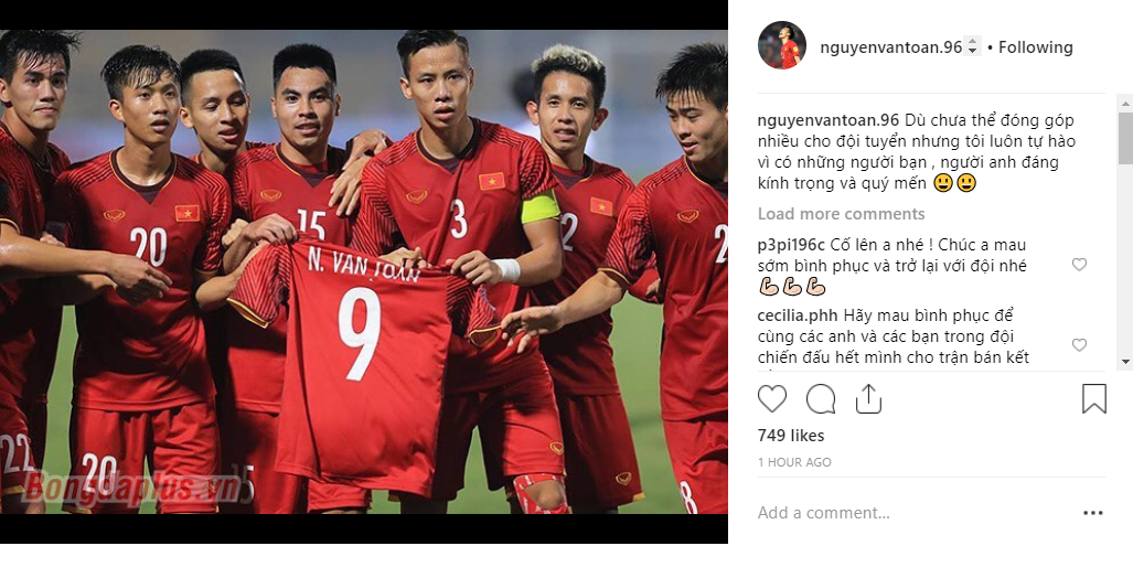 Văn Toàn cũng đăng dòng trạng thái cảm động cảm ơn những anh em, những người bạn, những người động đội trên Instagram của mình.