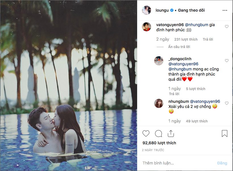 Không chỉ nhận về gần 80.000 lượt thích và những lời khen ngợi, ngưỡng mộ từ dân mạng, bài đăng ngọt ngào của Trang Lou gửi tới chồng còn nhận được cả sự chú ý từ Văn Toàn. Chân sút của HAGL không ngần ngại gắn tên bạn gái Nhung Bum vào dưới bài đăng kèm theo dòng bình luận: “Gia đình hạnh phúc” kèm biểu tượng mặt cười.