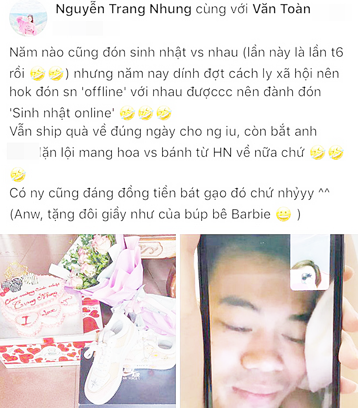 “Năm nào cũng đón sinh nhật với nhau (lần này là lần thứ 6 rồi) nhưng năm nay dính đợt cách ly toàn xã hội nên không đón sinh nhật “offline” với nhau được nên đành đón “sinh nhật online”.