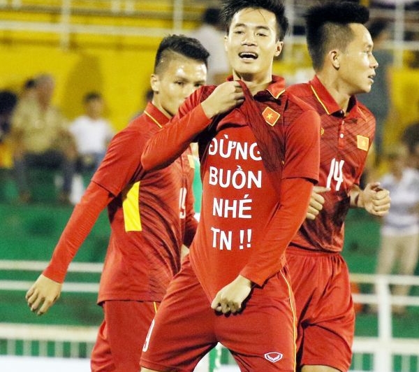 2 năm trước, trong cuộc đọ sức giữa U22 Việt Nam và U22 Macau, Văn Toàn có màn ăn mừng khiến cộng đồng mạng sững sốt khi để lộ chiếc áo phía trong với thông điệp yêu thương: “Đừng buồn nhé, TN”.