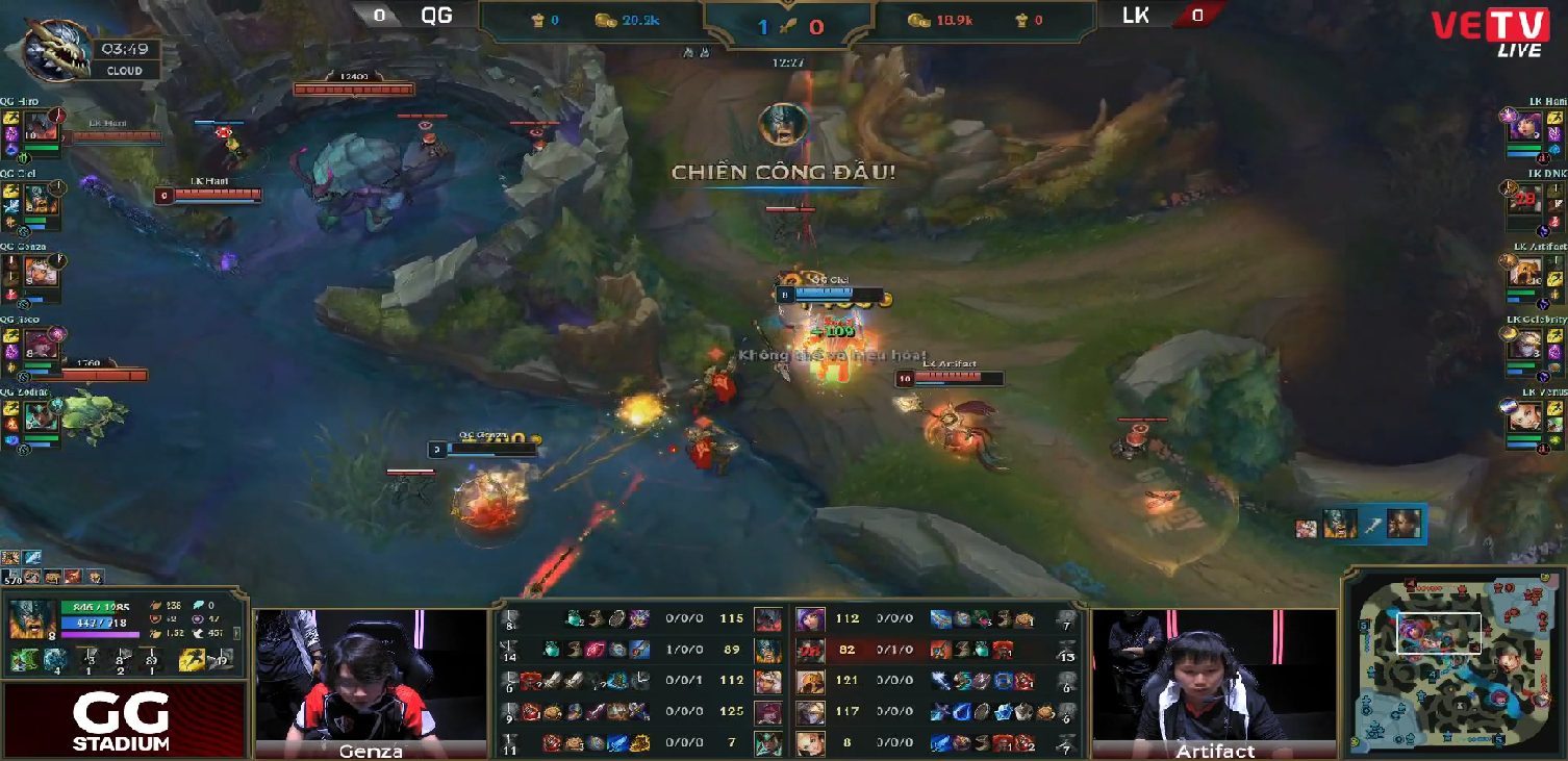 Thế trận diễn ra vào đầu game 1 cho đến phút thứ 12 khá cân bằng khi cả 2 đội chủ động farm hòa và chỉ kiếm soát lấy tầm nhìn. Thế cân bằng chỉ được phá vỡ vào phút 13 của trận đấu, bắt đầu từ một pha giao tranh tại khu vực gần bãi chim bên phía đội đỏ cùng sự tỏa sáng của con bài Olaf trong tay Ciel, QG đã lấy được cho mình 3 mạng hạ gục và chỉ để lại 1 mạng từ người chơi đường giữa Genza.