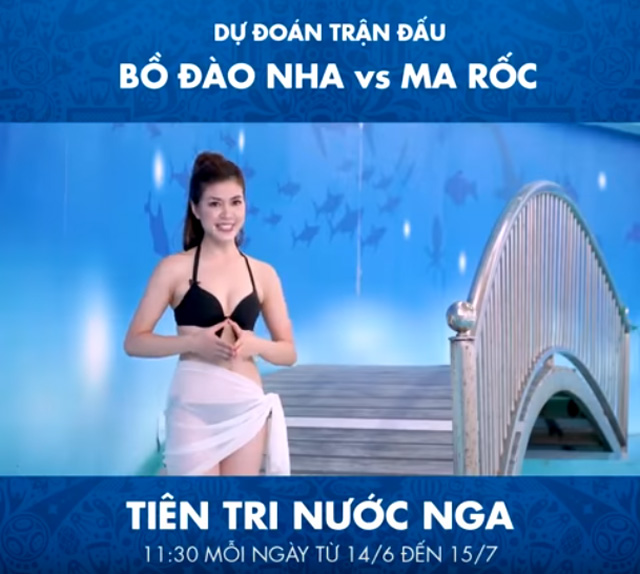 MC Thu Hằng trong trang phục bikini khi dẫn chương trình ‘Tiên tri nước Nga’. Ảnh: FBNV.