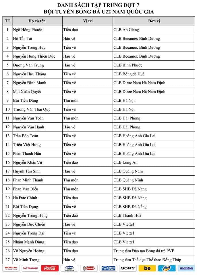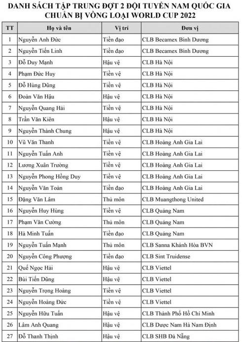 Liên đoàn bóng đá Việt Nam ( VFF) mới đây đã chính thức công bố 27 cái tên được tập trung để chuẩn bị cho trận gặp Thái Lan tại vòng loại World Cup 2022. Với nòng cốt là CLB HAGL và Hà Nội, HLV Park Hang Seo dường như đã chọn ra đầy đủ những cái tên chất lượng nhất.
