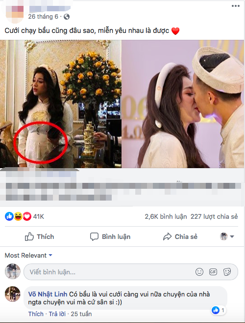 Bình luận dưới một bài đăng của fanpage, vợ Phan Văn Đức bày tỏ: “Có bầu là vui cưới càng vui nữa chuyện của nhà người ta chuyện vui mà cứ sân si”.
