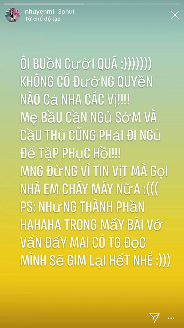 “Ôi buồn cười quá. Không có đường quyền nào nha các vị. Mẹ bầu cần ngủ sớm mà cầu thủ cũng phải đi ngủ để tập phục hồi! Mọi người đừng vì tin vịt mà gọi nhà em cháy máy nữa”, Huyền Mi - vợ Văn Quyết bức xúc thay cho em gái trước thông tin Duy Mạnh “đi quyền” với Quỳnh Anh vào tối 11/5.