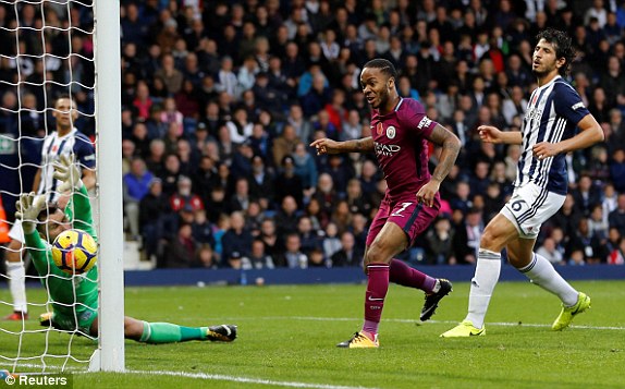 Raheem Sterling ghi bàn thứ 3 của Manchester City vào lưới West Brom.