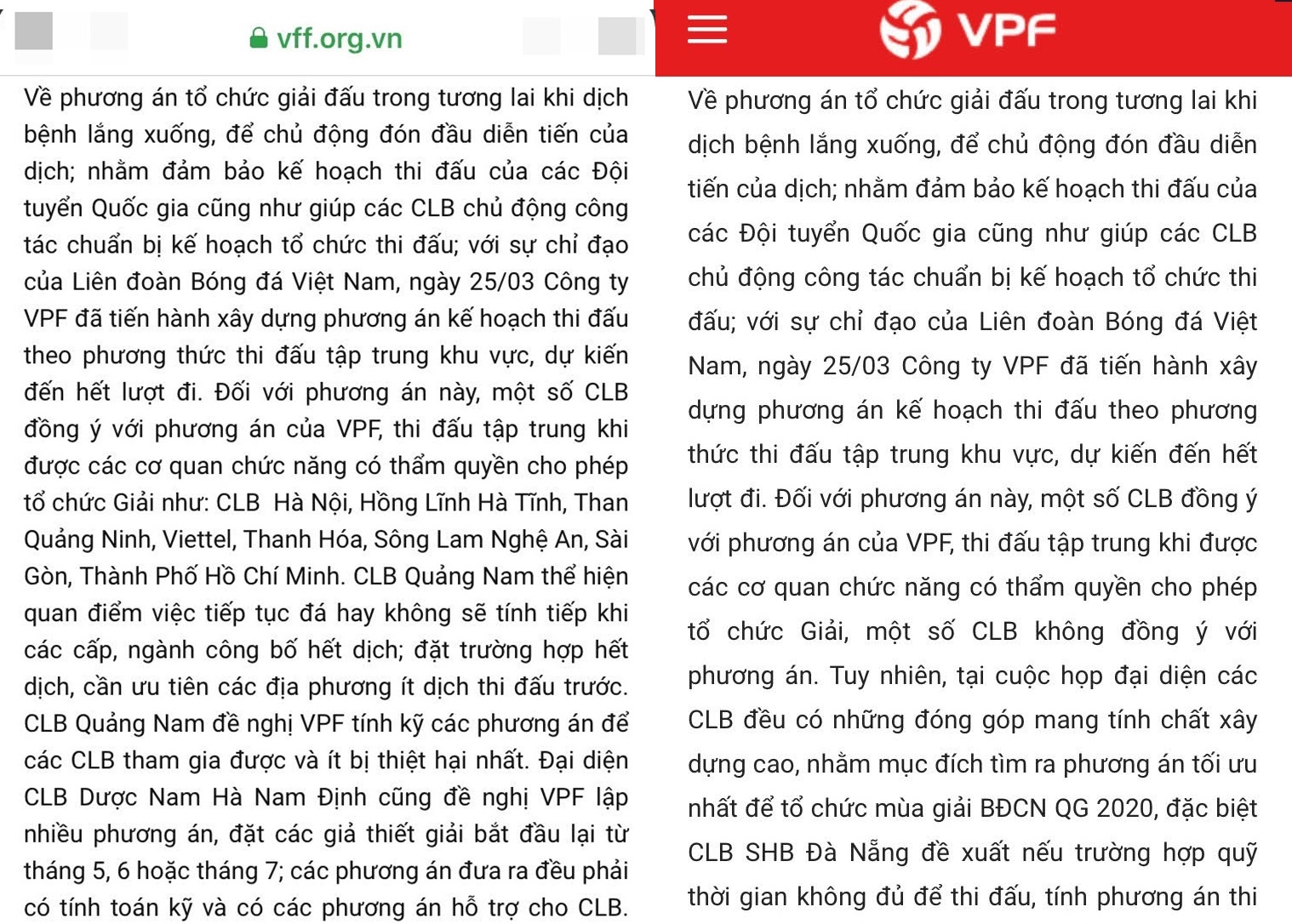 VFF dẫn thông tin ghi rõ Nguồn: VPF. Nhưng thông tin trên VFF đã khác so với trang VPF. Lãnh đạo CLB Sài Gòn cho biết VPF đã sửa thông tin về chuyện họ đồng ý. Ảnh chụp màn hình.
