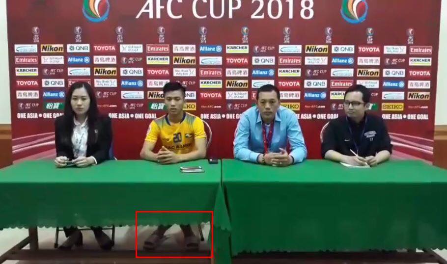 Hình ảnh Văn Đức họp báo sau trận với đôi dép lê.