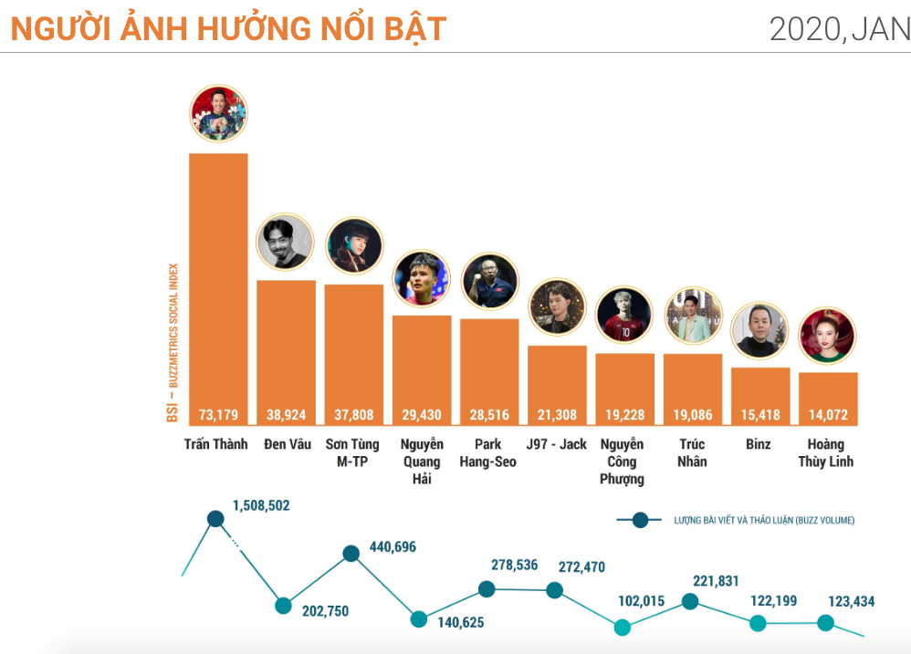 Nhân vật có ảnh hưởng số một MXH Việt Nam là MC Trấn Thành với số điểm vượt trội 73.179. Hai vị trí tiếp theo trong top ba lần lượt thuộc về Đen Vâu (38.924 điểm) và Sơn Tùng MTP (37.808 điểm).