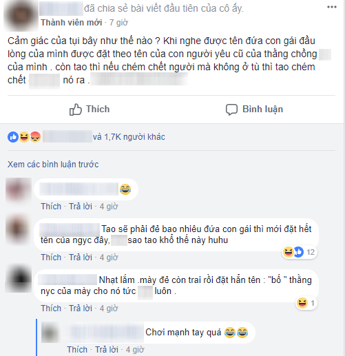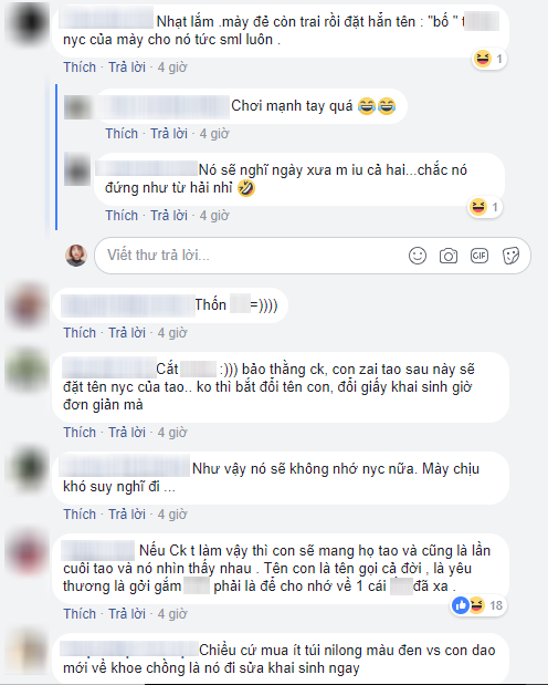 “Giờ bạn âm thầm chịu đựng trả thù đi. Đứa sau con trai đặt tên bố người yêu cũ cho “thâm””, tài khoản T.H bình luận.