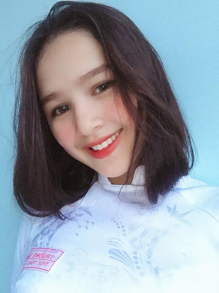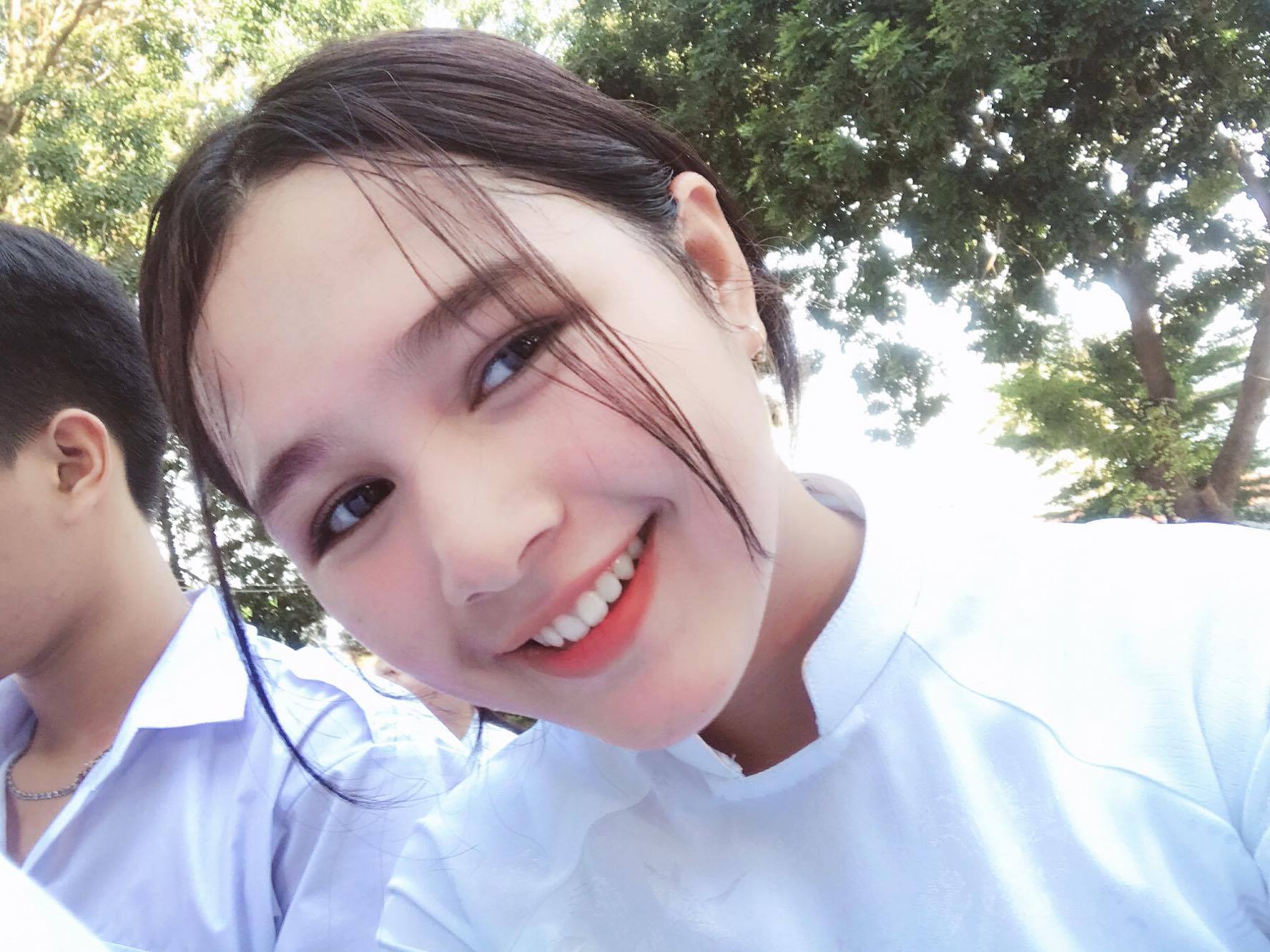 Trong bộ áo dài nữ sinh, mái tóc dài khẽ uốn nhẹ xoã ngang, cô nàng dễ dàng “đốn ngã” trái tim của bất cứ người nào với đôi mắt trong đen láy, nụ cười xinh tươi tỏa nắng, làn da trắng tinh và sống mũi cao. Bài viết thu hút hàng nghìn lượt like và share cùng vô số lượt comment “xin link” tìm kiếm bằng được thông tin của cô nàng.