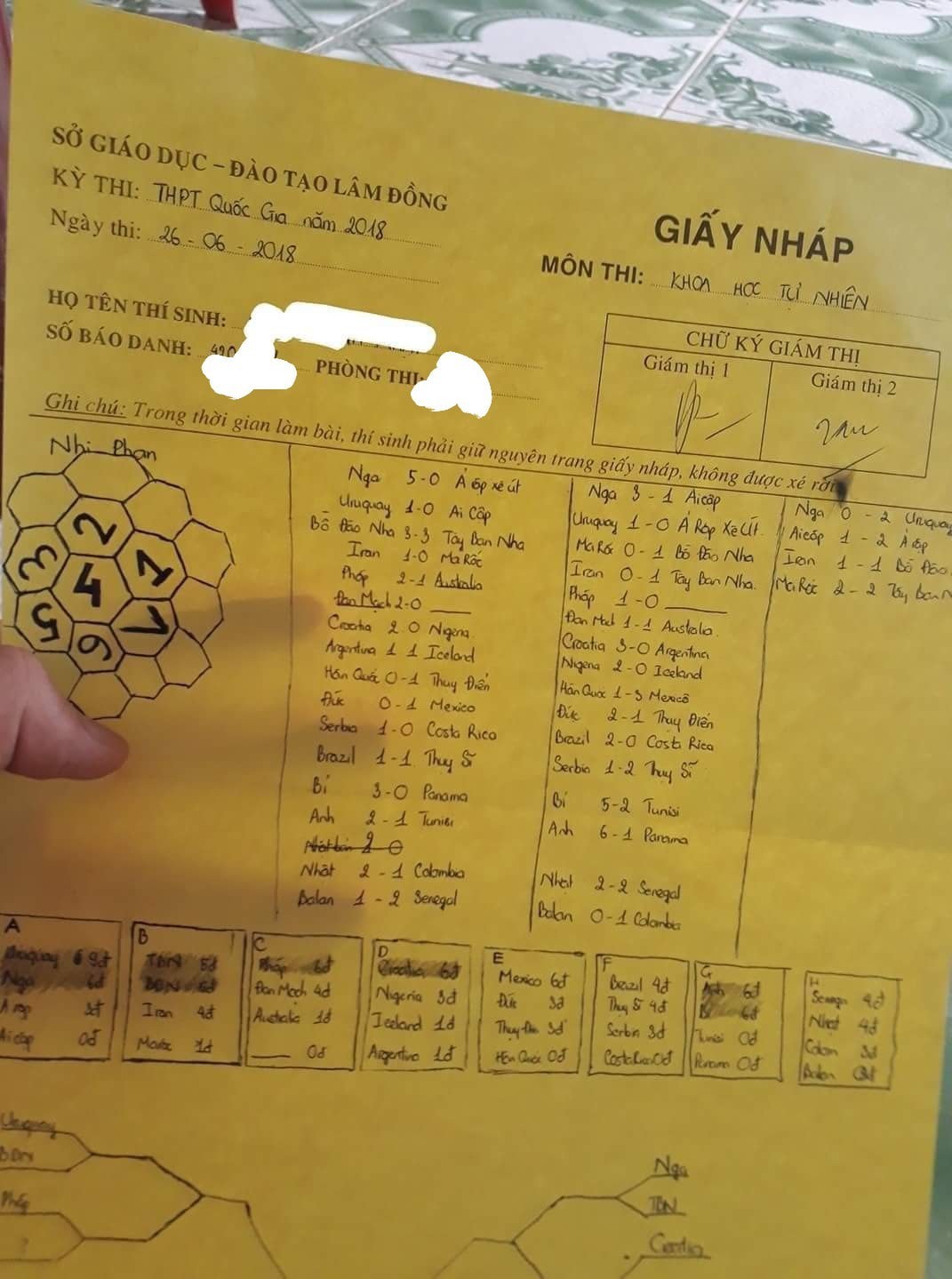 Nhật Minh (sinh năm 2000, tại Lâm Đồng) đã chia sẻ bức ảnh chụp tờ giấy nháp làm bài thi môn Hoá của mình ság nay lên MXH và nhận được sự quan tâm của nhiều người. Thay vì dùng giấy nháp để tính toán các công thức hoá học thì cậu bạn này đi tính… tỉ số các trận đấu World Cup. Không cần chú thích nhiều ai cũng hiểu cảm giác bất lực của nam sinh này khi cầm đề Hoá trên tay.