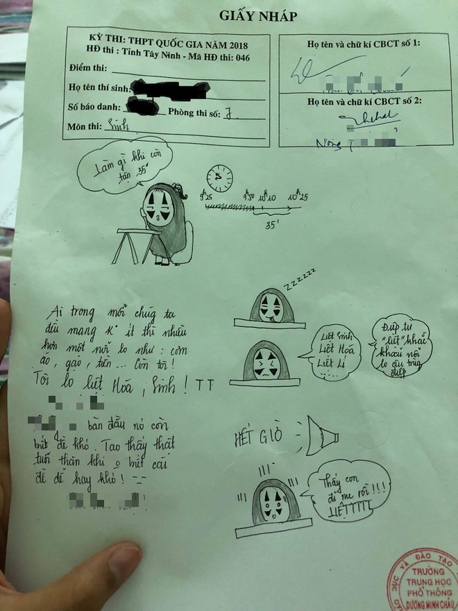 Nếu như Nhật Minh bế tắc với môn Hoá thì cô bạn Yến Nhi lại bất lực với môn Sinh. Giấy nháp môn Sinh cô nàng này dùng để vẽ và biến nó thành một tác phẩm truyện tranh độc thoại ngắn luôn. Bức ảnh được chia sẻ trên MXH cũng khiến dân mạng tự mình tìm ra câu trả lời cho câu hỏi: Sáng nay, bạn làm bài có tốt không?