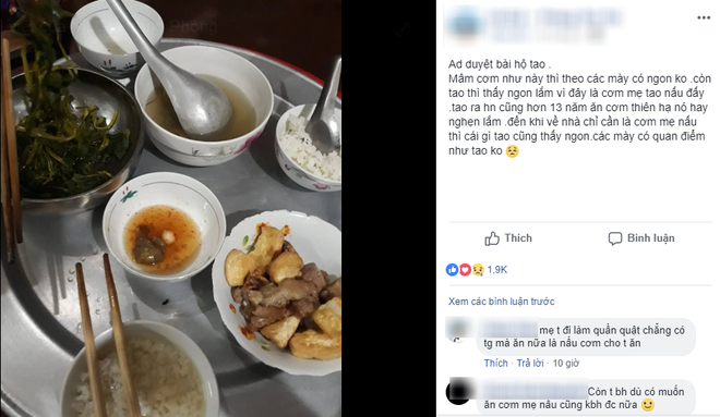 Hiểu hết nỗi lòng của một người con xa quê, xa mẹ nên câu chuyện dù ít nội dung này mới được đăng tải không bao lâu đã thu hút được rất nhiều sự quan tâm của cộng đồng người dùng mạng. Và tất nhiên, vì hiểu nên ai ai cũng đồng ý với quan điểm của anh chàng trên, rồi nhanh tay chia sẻ: “đúng vậy, cơm mẹ nấu là cơm ngon nhất trần đời”, “mẹ mình nấu sơ sài mà mình ăn hoài không biết ngán”, “mẹ là đầu bếp tài ba nhất trên đời”, “tự dưng đọc xong nhớ mẹ ở quê, thèm một bữa cơm gia đình”, “ở quê tuy nghèo nhưng ở đó có mẹ, có cơm mẹ nấu”,…