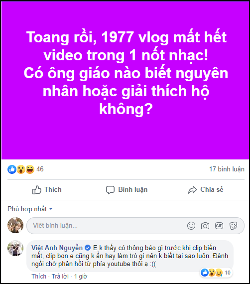 Nhiều người không hiểu lý do vì sao và Nguyễn Việt Anh - một trong những thành viên của Vlog 1977 cũng vậy. Cụ thể, trong một bài đăng của người bạn với nội dung: “Toang rồi, 1977 vlog mất hết video trong 1 nốt nhạc! Có ông giáo nào biết nguyên nhân hoặc giải thích hộ không?”, Việt Anh đã vào phản hồi.