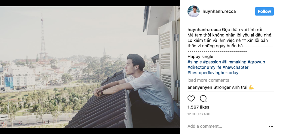 Năm vừa qua, sự tan vỡ của cặp đôi ”trai tài gái sắc” Hoàng Oanh và Huỳnh Anh đã gây tiếc nuối ra những ai từng yêu thích cặp đôi này. 6 tháng trước, chỉ bằng một tấm ảnh trên Instagram, Huỳnh Anh đã gián tiếp công bố chuyện chia tay bằng cách viết caption: “Độc thân vui tính rồi. Mà tạm thời không nhận lời yêu ai đâu nhé. Lo kiếm tiền và làm việc nè. Xin lỗi bản thân vì những ngày buồn bã. Happy single” kèm những hashtag như “single”, “hestopedlovinghertoday” (hôm nay, anh ấy dừng việc yêu cô ấy).