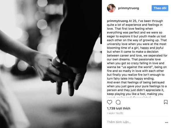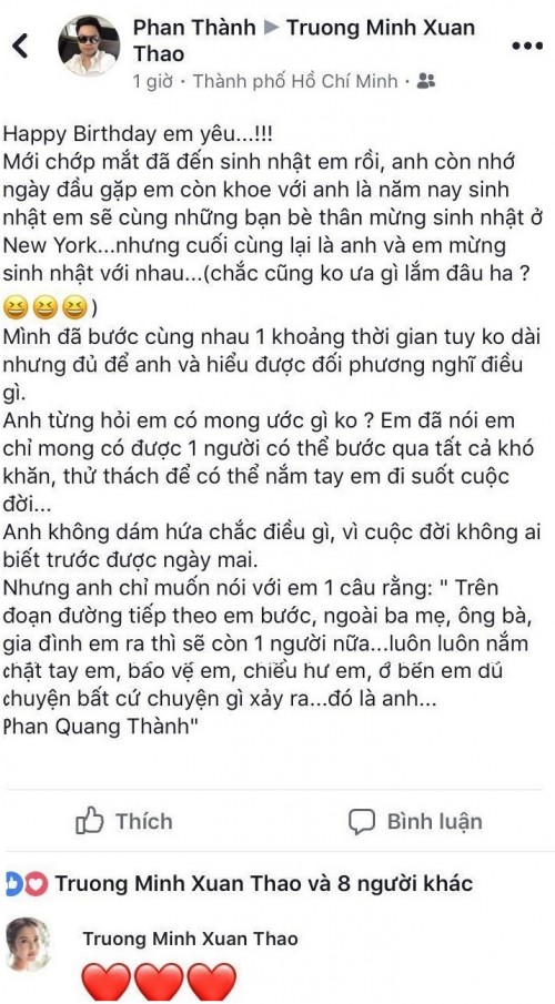 Đầu tiên là Primmy viết một tâm thư khá dài trên Instagram nói về chuyện tình yêu. Rồi tới Phan Thành liên tục đăng những bức ảnh tình cảm có ký hiệu T&T. Rõ ràng nhất là tới ngày sinh nhật của Primmy, Phan Thành đã ”mạnh dạn” gọi cô là ”Em yêu” trong bài viết chúc mừng sinh nhật của mình.