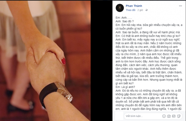 Và trong lúc mâu thuẫn giữa các người đẹp lên đỉnh điểm, Phan Thành đã có một bài chia sẻ khá dài trên mạng xã hội đầy ẩn ý khi kể lại đoạn hội thoại giữa anh và bạn gái mới.