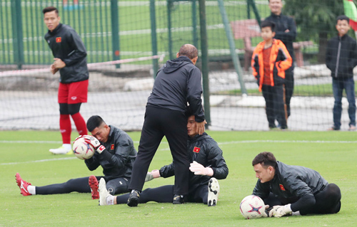 HLV Park Hang-seo động viên hai thủ môn Tiến Dũng (ở giữa) và Tuấn Mạnh (bên trái) chưa được ra sân phút nào tại AFF Cup lần này. Ảnh: Đức Đồng.
