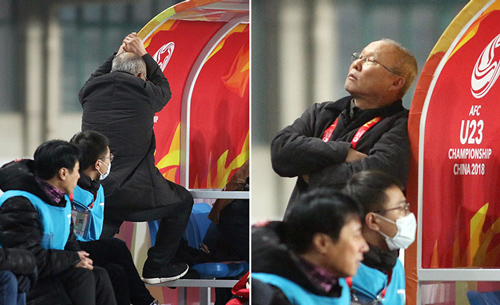 HLV Park Hang-seo không dám nhìn các học trò thi đấu trong những phút cuối cùng trận gặp Syria tại vòng bảng U23 châu Á hồi đầu năm. Ảnh: Đức Đồng.