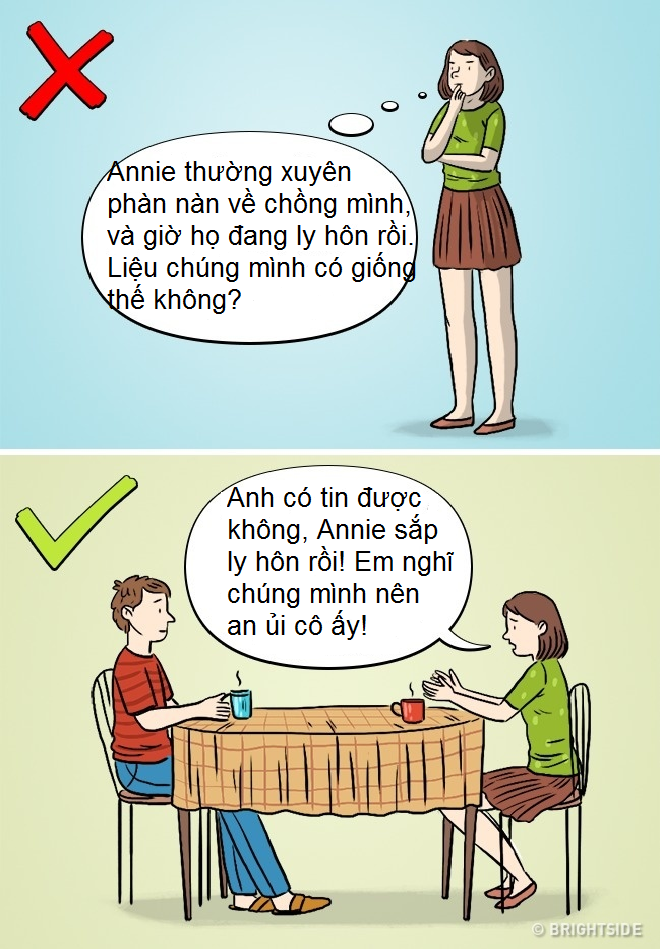 Để tránh trường hợp này xảy ra, không đồng nghĩa với việc bạn sẽ ngừng qua lại với người bạn của mình. Hãy cùng người bạn yêu ở cùng, quan tâm và chia sẻ với người đang trải qua những chuyện kinh khủng đó.