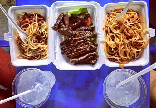 Cảnh người và xe máy xếp hàng dài trong một con hẻm trên đường Trần Hưng Đạo đợi mua mì Ý là điều quen thuộc vào mỗi chiều tối. Mì spaghetti được chế biến bởi chủ quán từng là bếp phó của một khách sạn 5 sao. Mì ở đây được yêu thích bởi sợi mềm, không bị dính, rất hòa quyện khi trộn sốt. Quán chủ yếu bán mang về, bởi hẻm nhỏ có rất ít chỗ ngồi. Một phần mì có giá 25.000 đồng. Phần bít tết bò Úc giá 95.000 cũng được đánh giá là ngon, bò mềm, đậm vị. Ảnh: Má Lúm.