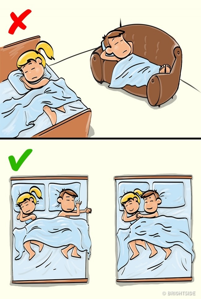 Ngủ riêng đồng nghĩa với việc bạn chưa thực sự sẵn sàng để đối mặt với người kia. Các thói quen hàng ngày, chẳng hạn như cùng nhau ngủ sẽ làm giảm căng thẳng và giải quyết xung đột nhanh chóng. Có thể đêm qua các bạn chẳng nói gì với nhau, nhưng khi ngủ dậy trong vòng tay đối phương, tâm trạng sẽ dịu xuống phần nào, thậm chí như chưa hề có “cuộc chiến nảy lửa” nào vậy.