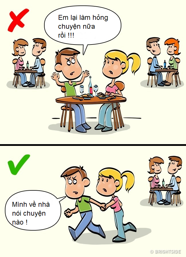 Nếu xảy ra tình huống các bạn tranh cãi ở nơi công cộng, điều này chứng tỏ rằng các bạn không tôn trọng nhau hoặc những người xung quanh. Đừng “vạch áo cho người xem lưng”. Tốt hơn hết nên mang vấn đề về nhà, “đóng cửa bảo nhau” giải quyết một cách êm đẹp.