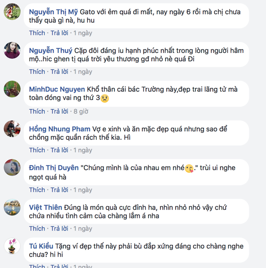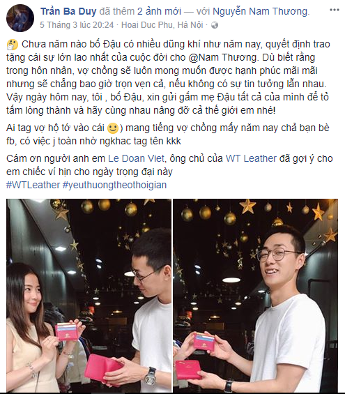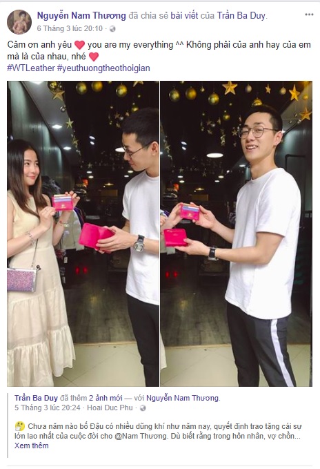Ba Duy lấy hết “dũng khí” trao tặng “sự lớn lao nhất của cuộc đời” của mình đến vợ là hot girl Nam Thương. Món quà là tấm lòng chân thành thể hiện sự tin tưởng của Ba Duy tới vợ. Nam Thương đã chia sẻ khoảnh khắc hạnh phúc này khiến người hâm hộ không khỏi ghen tị.