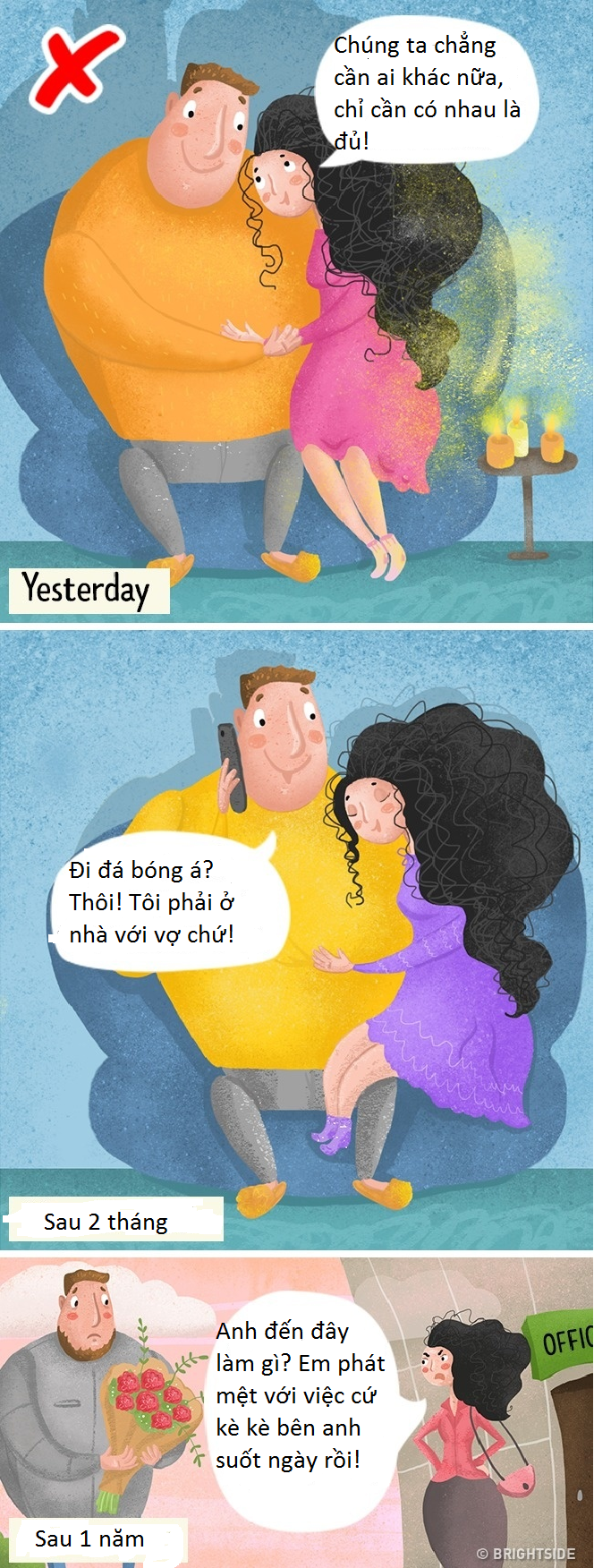 Các cụ có câu “xa thơm gần thối”. Các cặp đôi dù có yêu nhau đến mấy thì cũng cần có những khoảng không gian cho riêng mình. Lúc nào cũng quấn quít nhau, lâu dần sẽ tạo ra cảm giác bức bối khó chịu, chuyện cãi vã sẽ thường xuyên diễn ra.