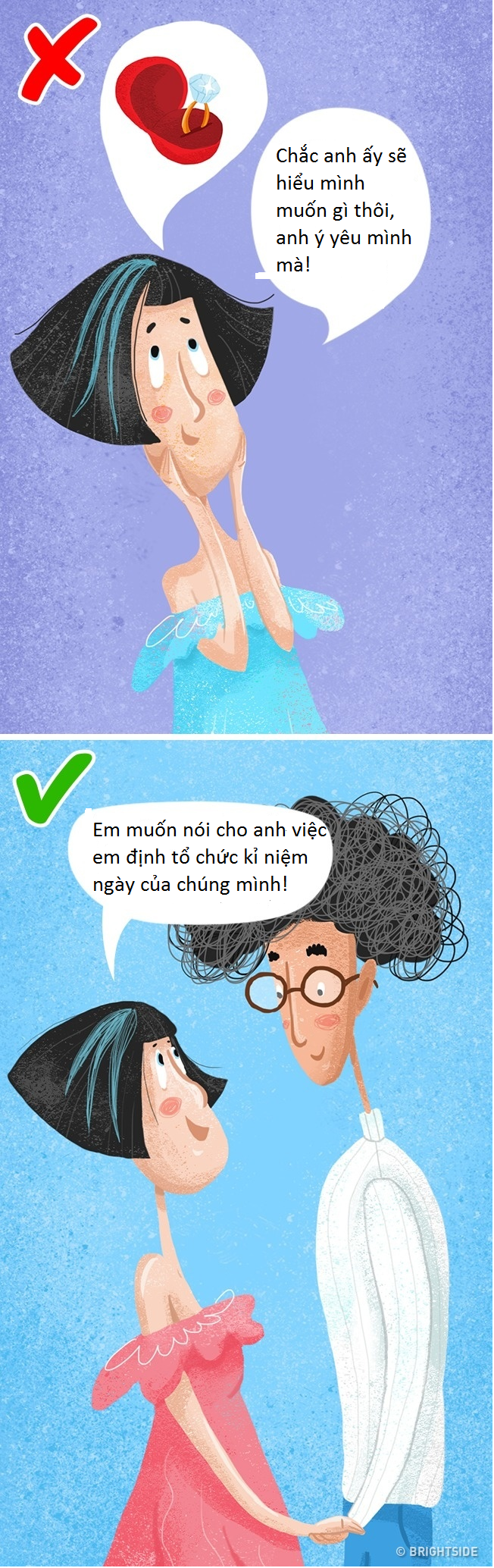 Người ta hay nói rằng “Yêu là có thể hiểu được suy nghĩ của nhau”. Đây là sai lầm cực kì nghiêm trọng vì chìa khóa của một mối quan hệ hài hòa là lắng nghe và chia sẻ cảm xúc cho nhau. Khi các bạn không chịu chia sẻ suy nghĩ cho đối phương, họ sẽ không thể nào hiểu hết họ muốn gì.