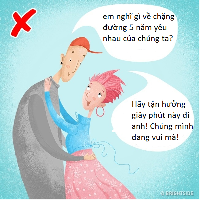 Khi mới yêu, thường thì các cặp đôi không đặt ra những dự định chung cho tương lai. Theo thời gian, tình cảm dần nguội lạnh, họ không biết sắp tới sẽ phải đối mặt với những chuyện gì, sợ hãi khi phải nghĩ đến tương lai. Để xây dựng một mối quan hệ bền chặt, cần lên kế hoạch cho tương lai và tốt nhất là nên tránh những câu hỏi làm người kia mệt mỏi như: trẻ em, tài chính, không gian cá nhân…