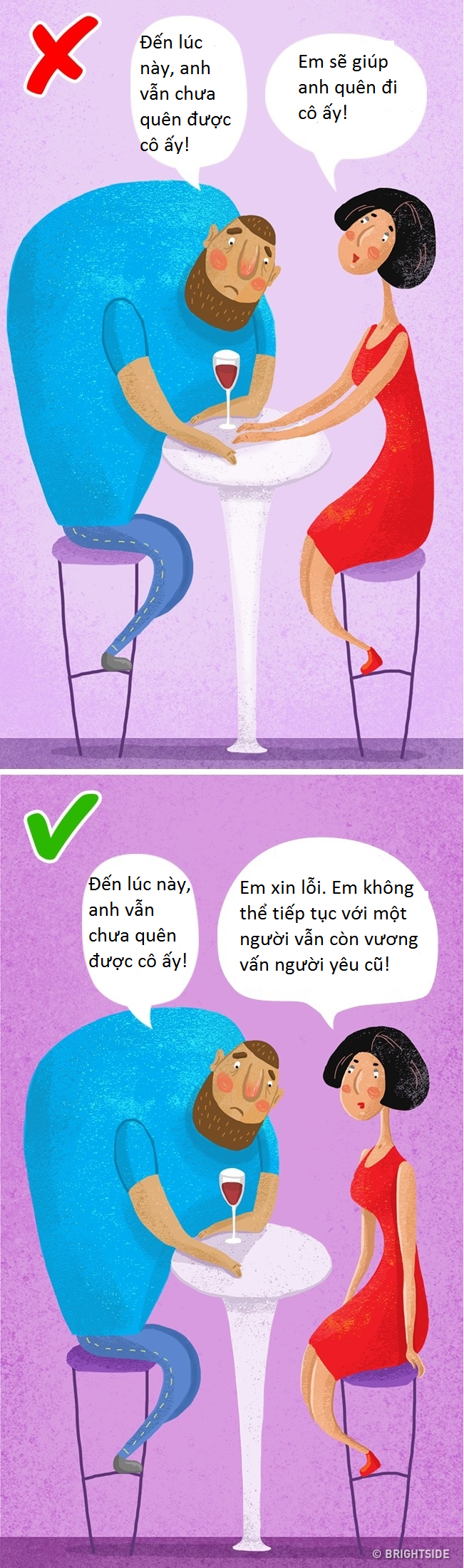 Khi đối phương chấp nhận ở bên cạnh chữa lành vết thương do người cũ để lại cho bạn, thoạt nhìn thì thấy cô ấy vui vẻ nhưng thực ra, chẳng ai mong muốn duy trì một mối quan hệ khi đối phương vẫn còn vương vấn người trong quá khứ cả. Cô ấy sẽ rất mệt mỏi chịu đựng mỗi khi bạn tâm sự. Một người tốt như vậy, bạn lỡ để cô ấy tổn thương sao?