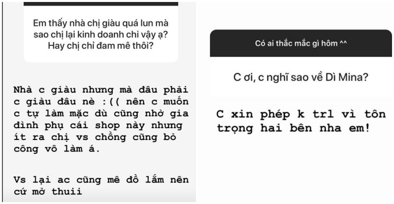 Cũng qua mục story này, Minh Anh cũng tránh nói về dì Mina - vợ hai của Minh Nhựa. Khi fans hỏi: ”Dì Mina không chụp ảnh cưới chung với gia đình chị hả?”, ái nữ Minh Nhựa đã xin phép không trả lời. Cô cũng từ chối nhận xét về dì Mina khi được fan yêu cầu.