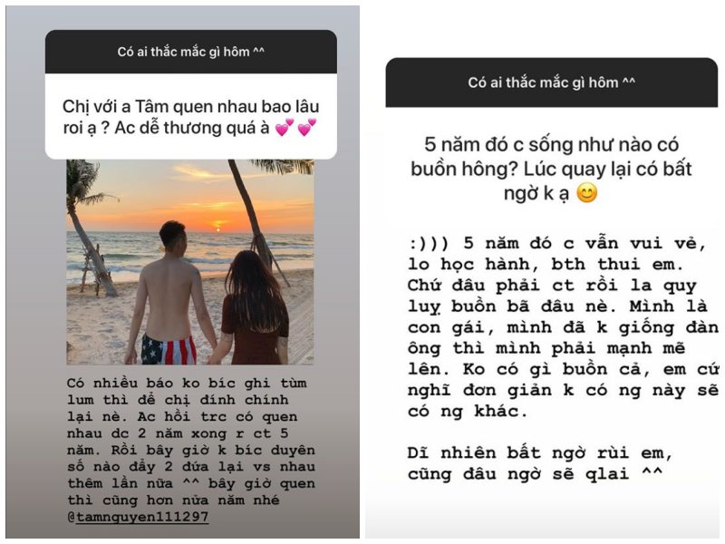 Cô cũng đính chính lại thông tin cho rằng cô và chồng sắp cưới quen nhau 5 năm. Thực chất, cô và chồng sắp cưới từng yêu nhau 2 năm, sau đó chia tay và cách xa tận 5 năm. Duyên số đã đưa hai người lại với nhau lần nữa, và cả hai chỉ cần nửa năm là đã quyết định cưới nhau.
