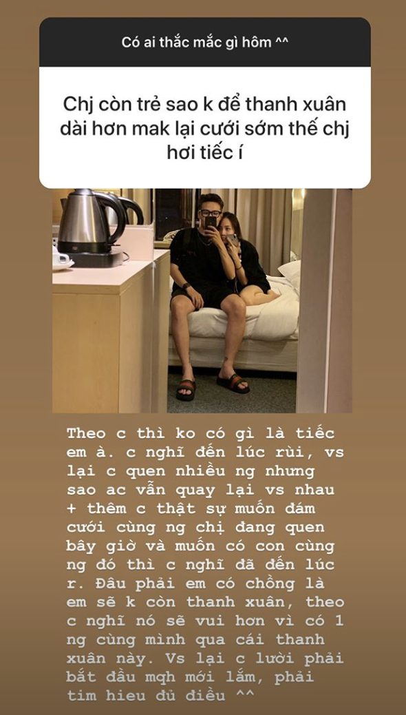 Mới đây, Minh Anh đã trả lời một loạt những thắc mắc của fan xung quanh việc lên xe hoa của mình. Câu hỏi mà cô nhận được nhiều nhất là Vì sao lại lên xe hoa ở độ tuổi quá trẻ - 20? Đáp lại, cô nói: “Theo chị thì không có gì là tiếc em à, chị nghĩ là đến lúc rồi. Với lại chị cũng quen nhiều người nhưng anh chị vẫn quay về bên nhau. Chị thật sự muốn đám cưới cùng người chị đang quen, chị muốn có con cùng người đó. Đâu phải em có chồng là sẽ không còn thanh xuân, theo chị nghĩ nó sẽ vui hơn khi có 1 người cùng mình trải qua thanh xuân này. Với lại, chị lười phải bắt đầu một mối quan hệ mới lắm, tìm hiểu đủ điều”.