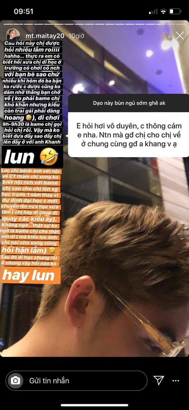 Theo đó, khi trả lời câu hỏi của một người hâm mộ rằng: “Như thế nào mà gia đình chị cho chị ở chung cùng gia đình anh Khang vậy ạ?”. Hotgirl 10X đã chia sẻ đầy bất ngờ: “Thực ra em có biết hồi xưa chị đi học ở trường có chơi có nói chuyện với bạn bè sao chứ nhiều khi ba bận không rước chị được cũng không dám nhờ thằng bạn chở về, đi chơi đến 9h - 9h30 là ba mẹ điện hỏi chị rồi”.