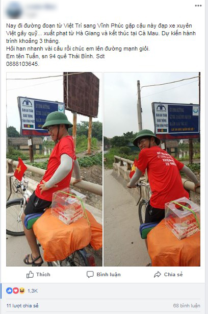 Chủ nhân câu chuyện viết trên một diễn đàn đông thành viên: “Nay đi đường đoạn từ Việt Trì sang Vĩnh Phúc gặp cậu này đạp xe xuyên Việt để gây quỹ từ thiện. Xuất phát từ Hà Giang và kết thúc tại Cà Mau. Dự kiến hành trình khoảng 3 tháng. Hỏi han nhanh vài câu rồi chúc em lên đường mạnh giỏi!”. Đồng thời, tài khoản L.M còn chia sẻ 2 tấm hình về nhân vật chính trong câu chuyện trên.