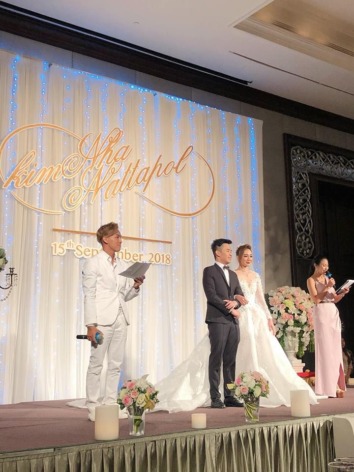 Đám cưới được tổ chức tại một trung tậm sự kiện lớn ở Thái Lan. Sử dụng tông màu trắng là chủ đạo, không gian lễ cưới trông vô cùng sang trọng, nhã nhặn nhưng không kém phần tinh tế. Kim Nhã diện bộ váy cưới màu trắng nổi bật, thu hút toàn bộ ánh mắt nhìn của mọi người trong khán phòng. Chiếc bánh cưới khổng lồ được đặt ở trung tâm để chúc mừng đôi uyên ương sẽ trăm năm hạnh phúc. Màn hình lớn còn chiếu lại những khoảnh khắc tình tứ của Kim Nhã và Nat Chan, đánh dấu những giây phút lãng mạn mà cặp đôi đã có với nhau.
