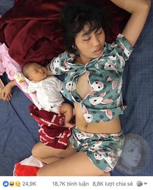 Trong bức ảnh, bà mẹ Nhã Trang bơ phờ, đầu tóc rối bời, áo cho con bú xong còn chưa kịp cài cúc đã… lăn ra ngủ say không biết gì, gần như “cạn pin” trước khi tiếp tục công cuộc ăn bỉm sữa, ngủ bỉm sữa, khóc, trớ…