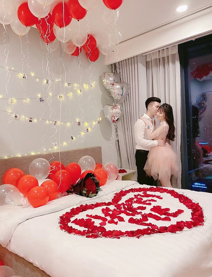 Mới đây, nhân dịp lễ tình nhân, Trọng Hưng đã lên kế hoạch tổ chức ngày đặc biệt này để gây bất ngờ cho Hà My. Trong căn phòng ngủ của mình, anh dùng bóng bay và hoa hồng màu đỏ để trang trí. Trên bàn tiệc là những bức ảnh cưới cùng bánh kem, rượu vang. Tất cả tạo nên một không gian cực kỳ ấm cúng, lãng mạng mà mọi cô gái đều mơ ước.