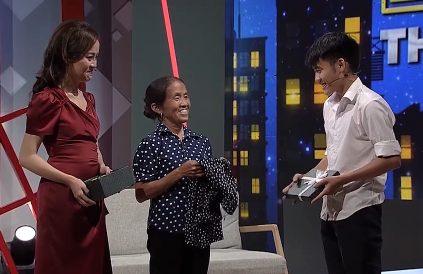 Cảm động hơn nữa, anh đã tặng mẹ một món quà bất ngờ ngay trong chương trình. Bà Tân cảm thán: ‘Sống 60 mùa bánh chưng nhưng nay mới được con trai tặng quà’. Và bên trong chiếc hộp là một chiếc áo chấm bi dài tay.